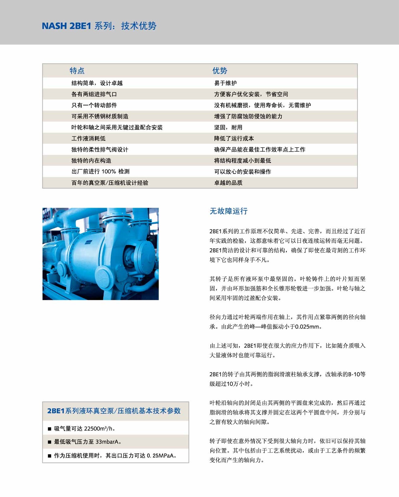 NASH 2BE1系列液環真空泵/緊縮機吸宇量可達22500m<sup>3/h,低吸氣壓力至33 mbar 。作為緊縮機利用時,其出口壓力可達0.35MPa.另外,還能夠挑選頂端排氣或程度排氣,以便于裝置,運行靠得住.因為只要一個動彈件(葉輪),且不金屬間的間接磨擦,elmo的平圓盤式設想現實上防止了磨損,即使在多年的持續運行以后也是如斯。