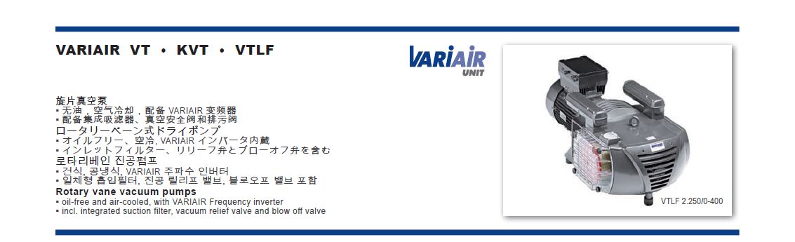無油旋片真空泵包羅以下型號:VT4.4、VT4.8、VT4.10、VT4.16、VT4.25、VT4.40、KVT3.60、KVT3.80、KVT3.100、KVT3.140、VTLF2.250、VTLF2.360、VTLF2.500